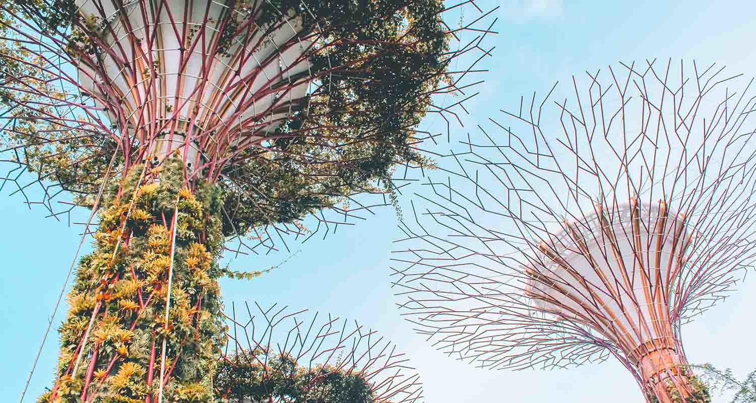 Another good example of how nature is included in architectural design are the Supertrees, 50-metre tall artificial trees located in the famous Gardens at the Bay. These structures offer a light show (powered by solar energy) and also have more than 150,000 real plants embedded on its sides.